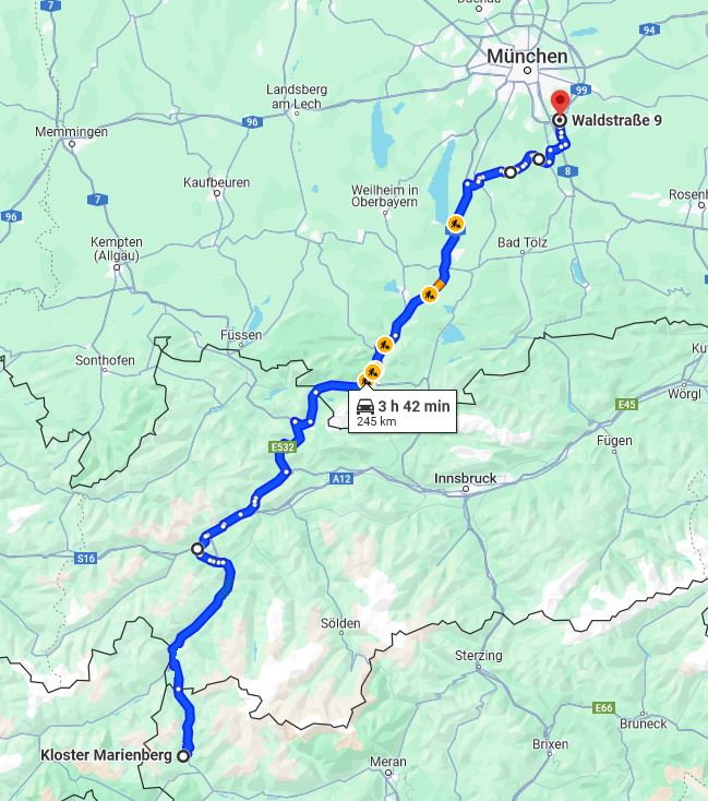 Reschenpass, Landeck, Fernpass, GAP, A95 bis Wolfratshausen, dann quer rüber...