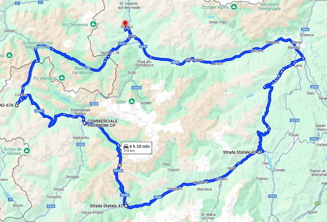 Vom Kloster über den Ofenpass nach Livigno, Bormio, über den Gavia- und Tonale-Pass ins Ultental, Lana und wieder nach Burgeis...